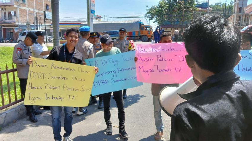 WARTAWAN24.COM – Sebuah aksi unjuk rasa digelar oleh Aliansi Mahasiswa dan Pemuda Anti Korupsi di depan Markas Kepolisian Daerah Sumatera Utara (Polda Sumut) pada Rabu siang (28/5/2025). Aksi ini menuntut penanganan serius terhadap laporan kekerasan seksual yang melibatkan anggota DPRD Sumut dari Partai Demokrat, Fajri Akbar.